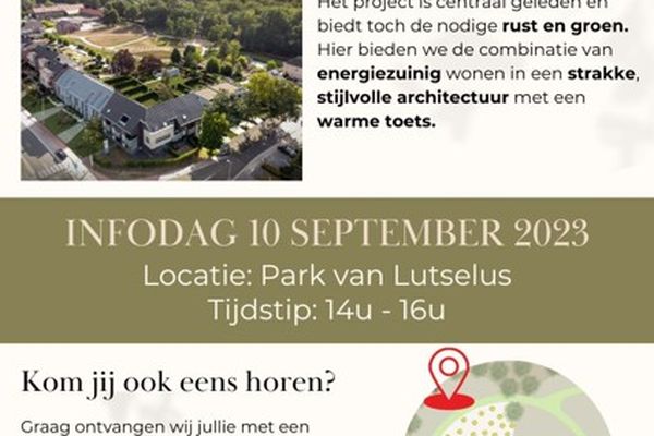 Wees welkom voor een drankje en meer informatie op onze infodag zondag 10 september van 14u tot 16u te Lutselus Park!