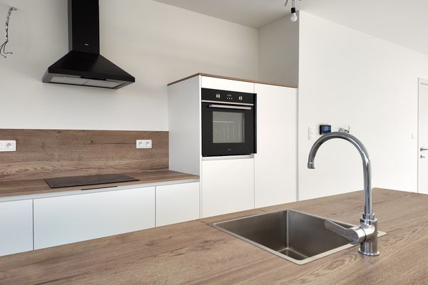 Bij binnenkomst verwelkomt de inkomhal je met een gastentoilet. De lichtrijke leefruimte met eetgedeelte vormt het hart van de woning en sluit naadloos aan op de moderne keuken met centraal eiland en hoogwaardige inbouwtoestellen.