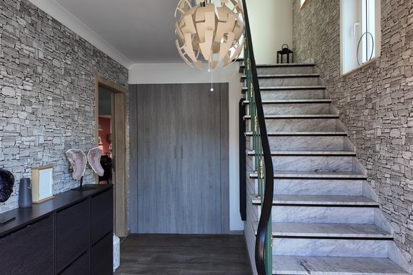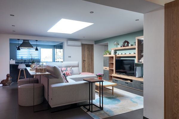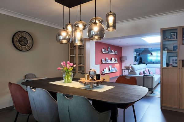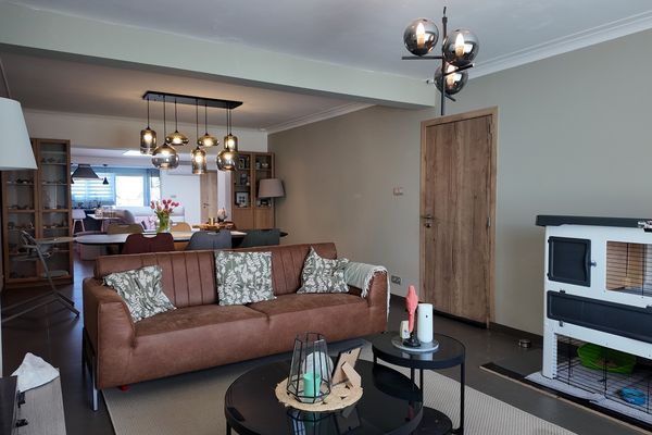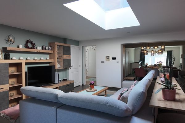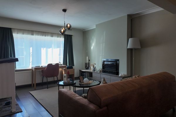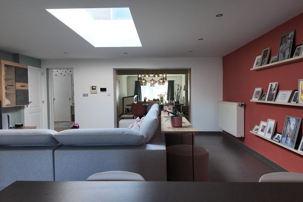 We betreden de woning via de inkomhal met vestiaire, die toegang biedt tot de ruime en lichtrijke leefruimte. Vooraan bevindt zich een zithoek aan de sierhaard, die momenteel ingericht is als bureauruimte. Aansluitend komen we in de eethoek, die naadloos overloopt in een tweede zithoek. Dankzij de dakkoepel geniet deze ruimte van een aangename lichtinval en een open, ruimtelijk gevoel.