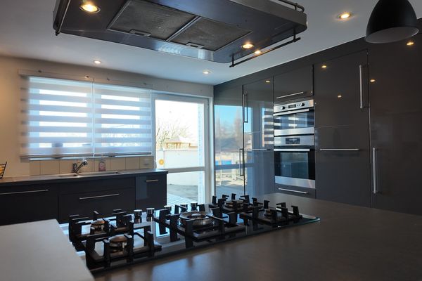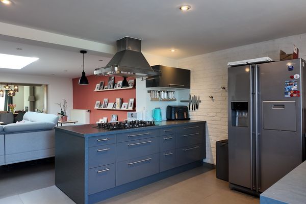 De open keuken is uitgerust met alle nodige toestellen, waaronder een gaskookplaat, en biedt directe toegang tot de ruime, afgesloten tuin – perfect voor gezinnen en tuinliefhebbers.