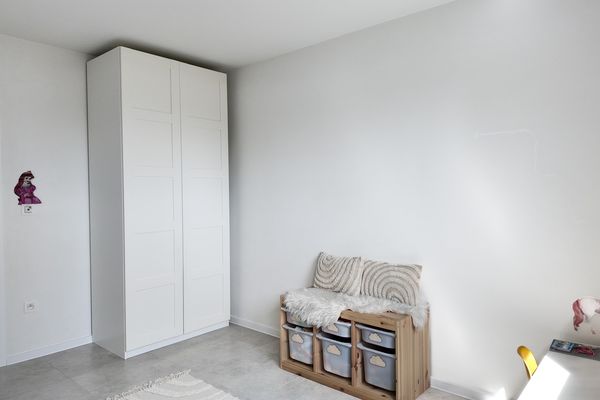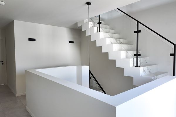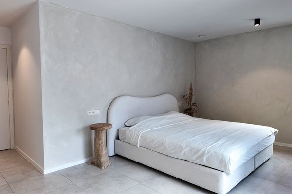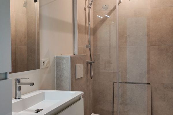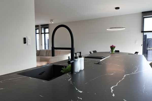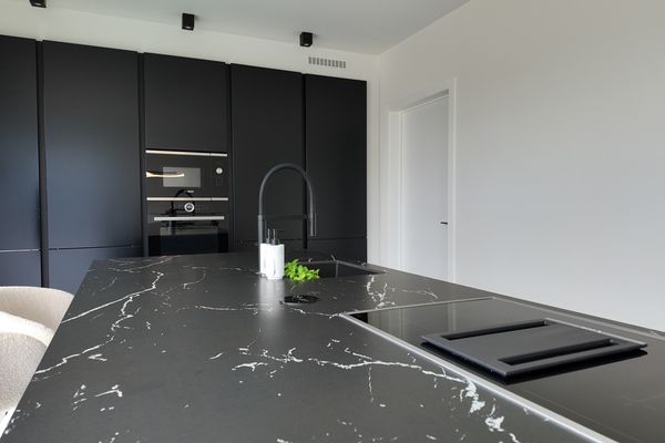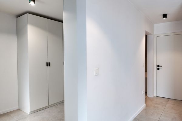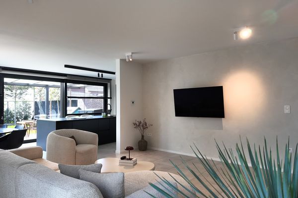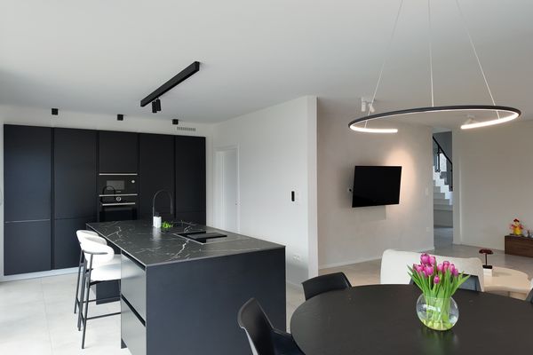 De inkomhal geeft toegang tot de lichtrijke leefruimte met airconditioning. De open woonkamer staat in directe verbinding met de stijlvolle zwarte designkeuken met keramisch werkblad. Deze is volledig uitgerust met kwalitatieve toestellen: een oven, magnetron, vaatwasser en een inductiekookplaat met ingebouwde afzuiging. Dankzij de grote raampartijen geniet de leefruimte van een overvloed aan natuurlijk licht. Aansluitend vind je nog een praktische berging met aansluitingen voor wasmachine en droogkast, en voldoende ruimte voor extra stockage.