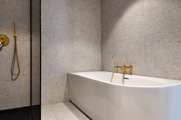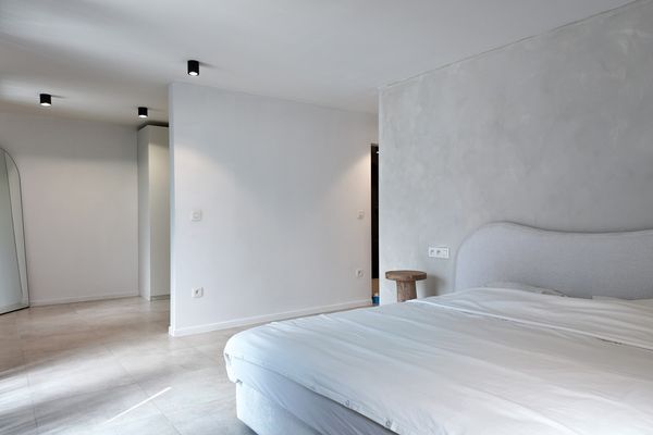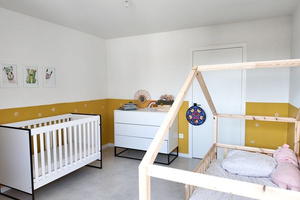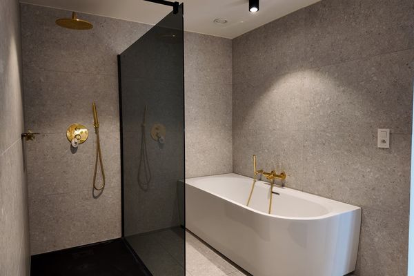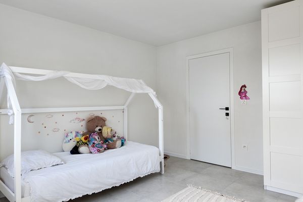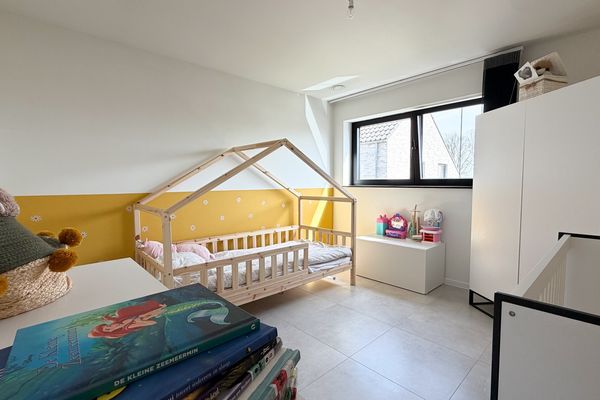Op de eerste verdieping bevinden zich twee ruime kinderkamers en een kleine badkamer met douche, toilet en wasmeubel. De master bedroom beschikt over een eigen badkamer, uitgerust met een ligbad, inloopdouche en wasmeubel, alsook een aparte inloopdressing.