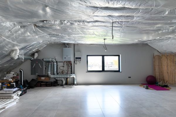 Via een vaste trap bereik je de tweede verdieping, waar zich een zolderruimte van maar liefst 75 m² bevindt. Deze kan perfect ingericht worden als extra slaapkamer, hobbyruimte, bureau of polyvalente ruimte.
